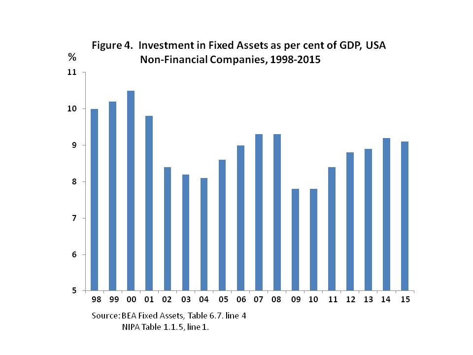 What Figure 3 shows is that in the recovery from the downturn of 2000-1, investment climbed steeply right through until 2007, rising by 45 per cent, from $900 billion to $1.3 trillion.  Even in 2008 investment was slightly higher than in the previous year.  Not until 2009 did investment fall, and it then quickly rose once again from 2010 through to 2015.  To control for the effects of inflation and of growth, in Figure 4 the same data for investment in fixed assets by non-financial companies are shown as a percentage of GDP.