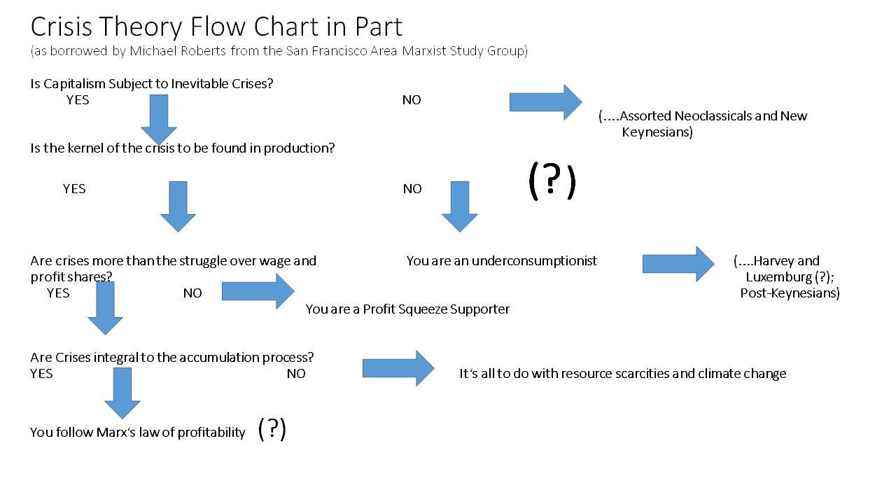 For Michael Roberts, David Harvey can be dismissed as just another underconsumptionist. My second smaller (?) on the chart puts in question that labelling of both Harvey and Rosa Luxemburg. Leaving Luxemburg to one side, I simply recommend Harvey’s A Companion to Marx’s Capital Volume 2 as a corrective to that oversimplistic reading and as a more innovative text than the title might suggest. I disagree with Harvey’s critique of Marx’s ordering of the texts of Capital and his interpretation of Marx’s dialectical method. Harvey is certainly wrong, for example, to suggest that Marx assumed ‘perfect competition’ ( a theoretical construction of neoclassical economics which postdates Marx) in Volume 1, and would benefit from reading up on the theory of ‘real competition’ in Anwar Shaikh’s recent magnum opus Capitalism. But that raises another set of issues I cannot address here. What matters in this context is Harvey’s vital emphasis on capital as always in motion, across time and space. But this process through the phases of the circuit can be blocked at any point and even a slowdown in the process of circulation can precipitate a crisis. This in turn enables Harvey to locate the centrality of the credit system and banking to overcoming these blockages – and justifies his inclusion of a lengthy section on credit and the banking system in Volume 3 of Capital in a commentary on Volume 2.